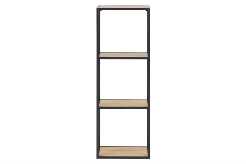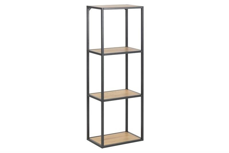W naszej ofercie dostępne są różne meble z serii Seaford przeznaczone do pomieszczeń o różnym przeznaczeniu i zastosowaniu – tutaj nowoczesny regał wiszący w stylu industrialnym z półkami w okleinie dębowej na czarnym metalowym stelażu.
