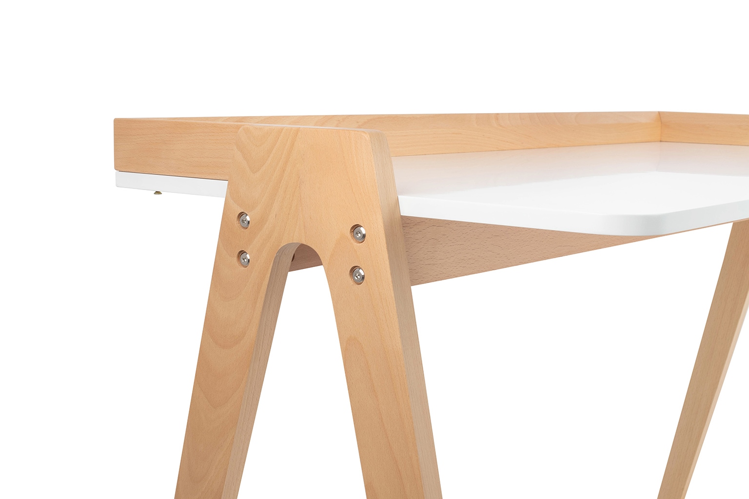 Blat biurka wykonany został z płyty meblowej malowanej na kolor biały, natomiast nogi biurka wykonane są z drewna bukowego.
