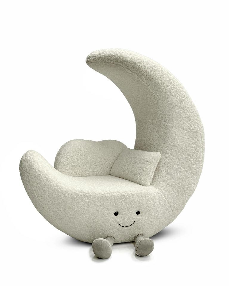 Uroczy i komfortowy fotel w kształcie księżyca, zaprojektowany z myślą o dziecięcych pokojach i przestrzeniach wypoczynkowych.