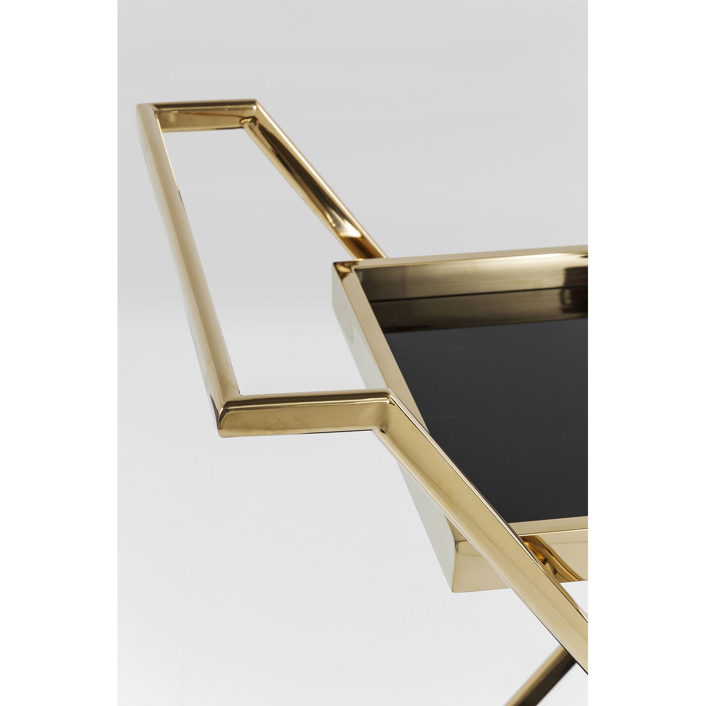 Dzięki stalowej ramie pokrytej mosiądzem oraz dwóm czarnym półkom ze szkła hartowanego łączy w sobie luksus i funkcjonalność.