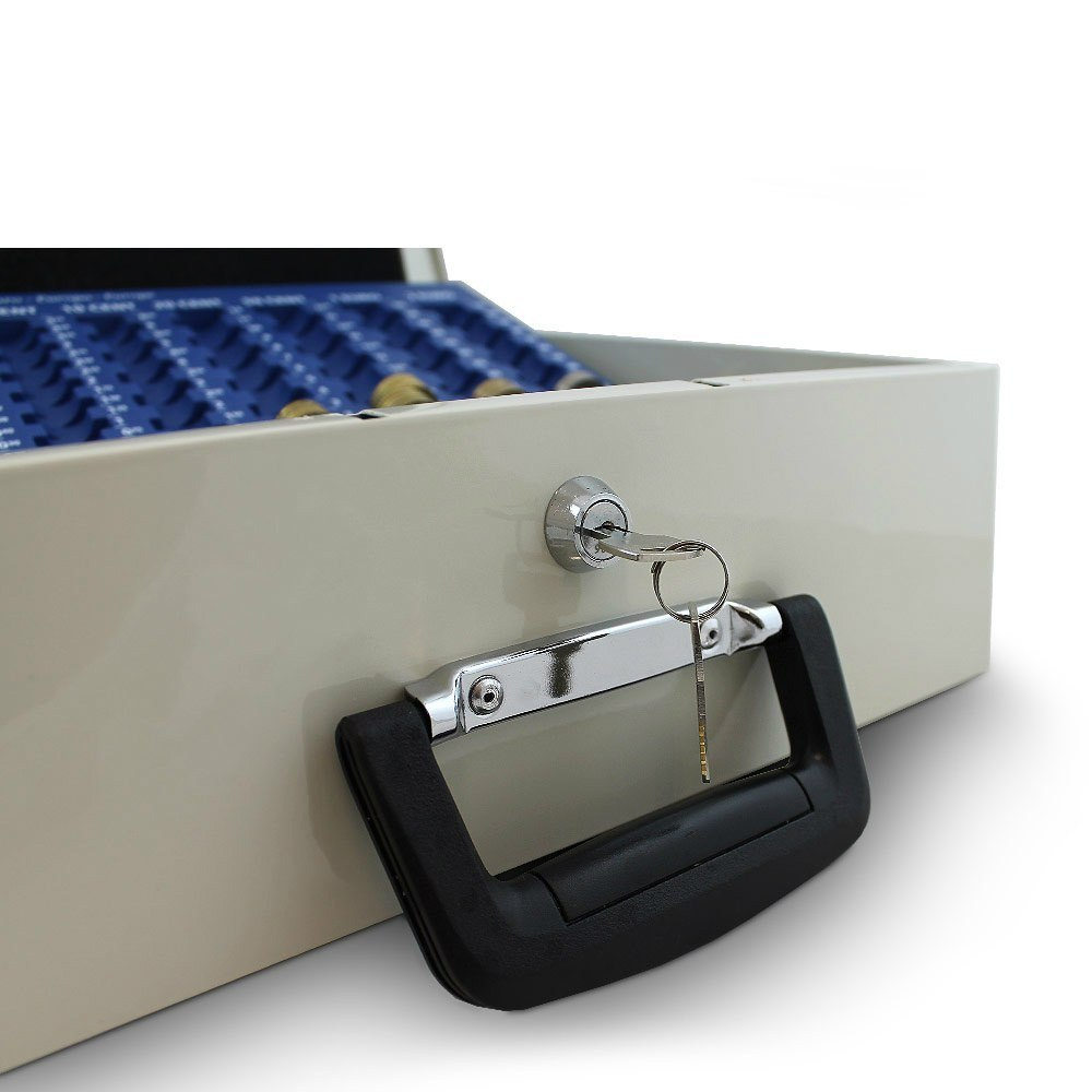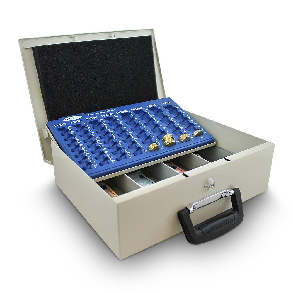 Solidna i poręczna walizka z metalu wyposażona w sortownik do monet jest idealnym miejscem do przechowywania banknotów oraz monet.Na dole jest sporo miejsca na przykład na rachunki, paragony, monety, banknoty i inne przydatne przedmioty. Dla bezpieczeństwa kasetka jest zamykana na klucz. Ergonomiczny uchwyt sprawia że transport staje się dziecinnie prosty.