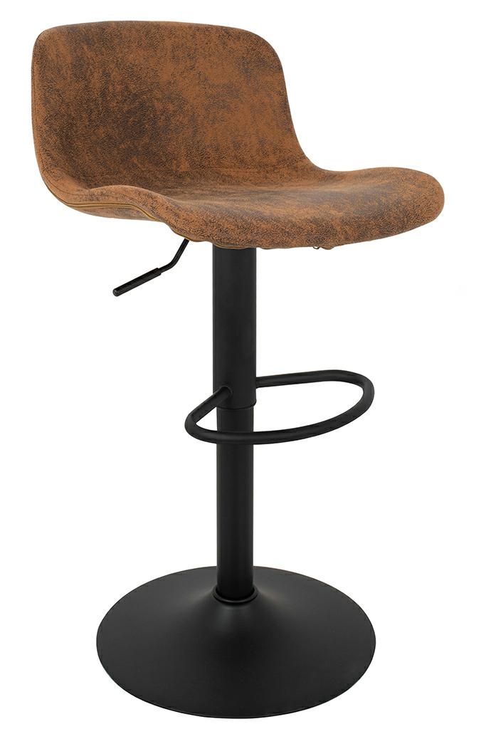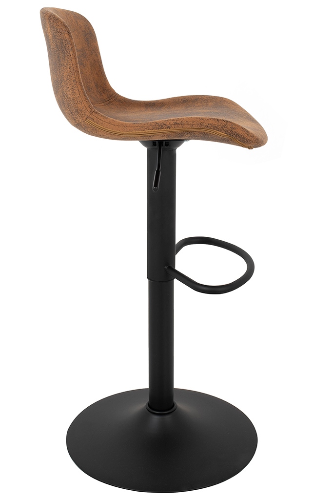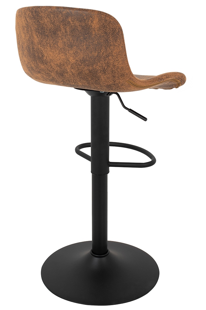 Obrotowe siedzisko wykonane z tworzywa sztucznego jest tapicerowane tkaniną imitującą skórę w kolorze brązowym.