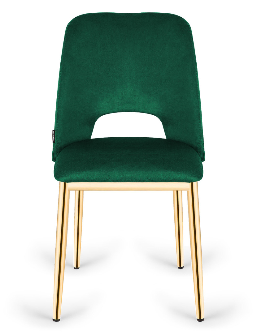 GOTI – Klasyczne krzesło na złotych nogach, tapicerowane welurem w kolorze butelkowej zieleni.