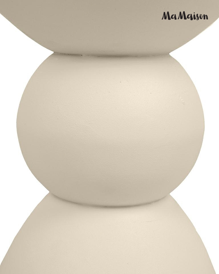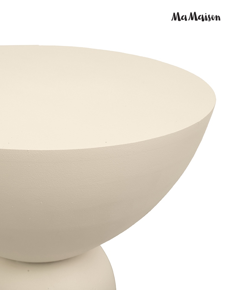 Wykonany z gładkiego MDF, zachwyca miękką linią i geometrycznym kształtem – kulista forma osadzona między stożkową podstawą a półokrągłym blatem tworzy wyjątkową, balansującą sylwetkę. Spokojna, jansnobeżowa kolorystyka idealnie komponuje się z wnętrzami utrzymanymi w stylu japandi, skandynawskim lub nowoczesnym.