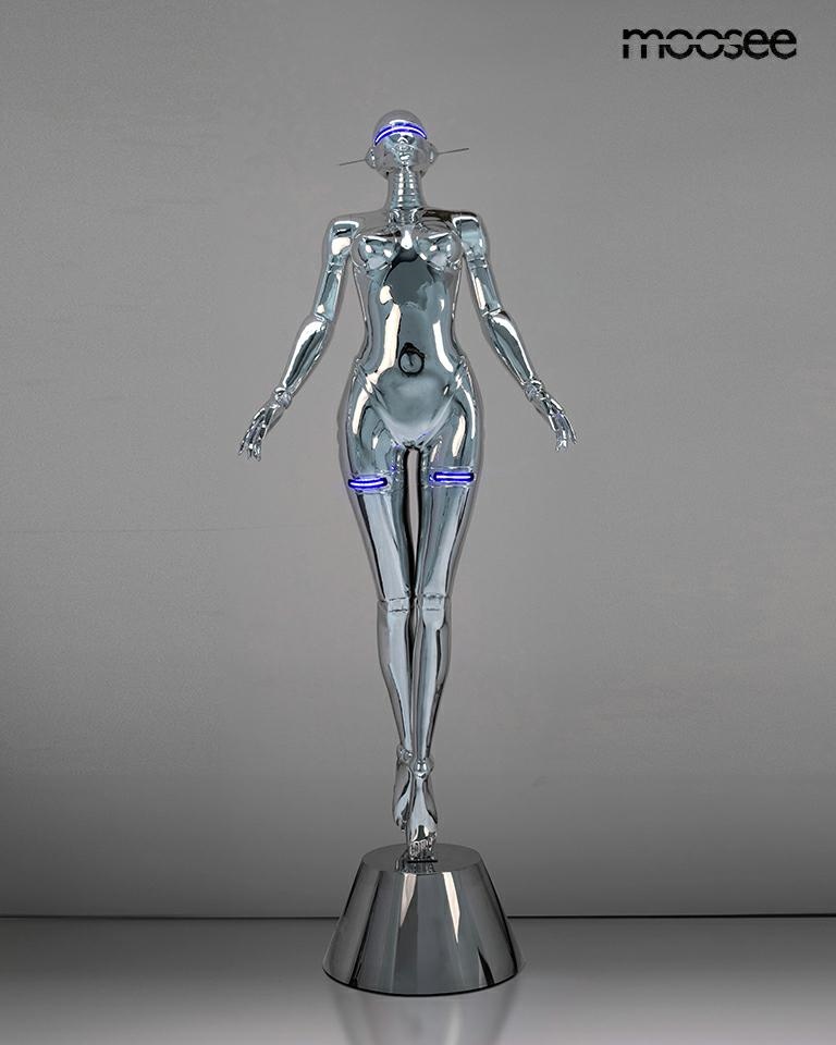Smukła, kobieca sylwetka wykonana z błyszczącego chromu tworzy oryginalną rzeźbę, której lustrzane wykończenie odbija otoczenie, tworząc hipnotyzującą grę światła i przestrzeni. Wbudowane niebieskie oświetlenie LED subtelnie rozświetla ciało postaci, tworząc kosmiczny klimat niczym z filmów.