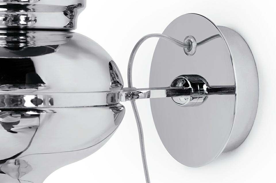 Gładki abażur został wykonany z tworzywa sztucznego i jest błyszczący. Stelaż lampy został uformowany z aluminium i ma lustrzany połysk.