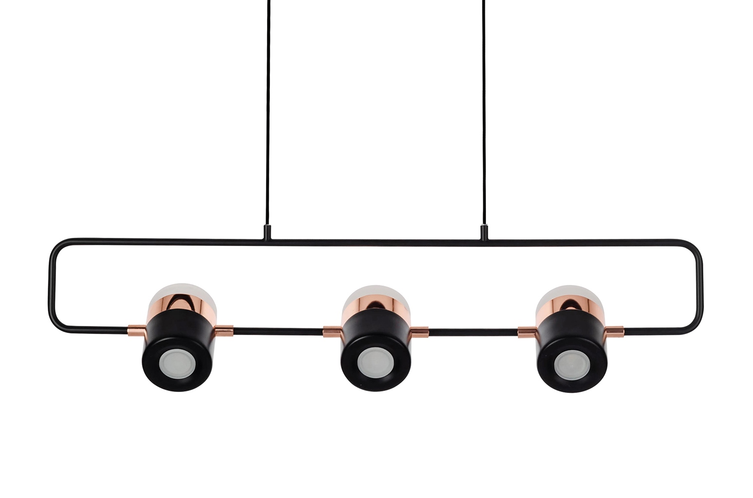 wyjątkowa estetyka i dokładność wykonania, klosze są z aluminium w kolorze czarnym z matowym wykończeniem, szyku dodają dodatki w kolorze miedzianym. Górna część oprawy wykonana została z mlecznego tworzywa sztucznego, które rozprasza światło.