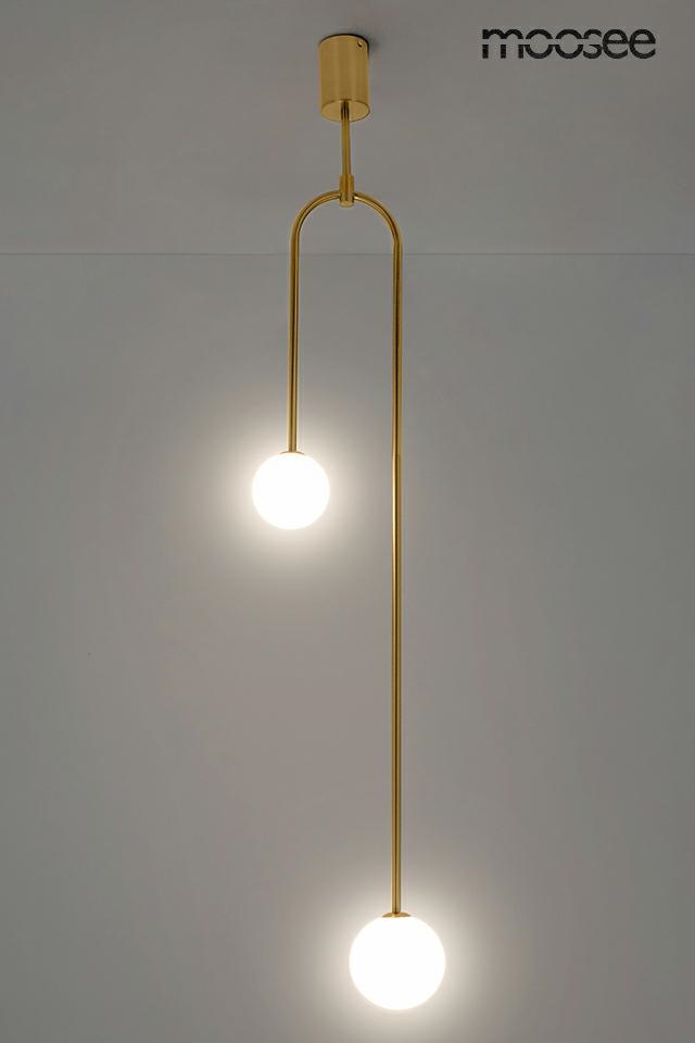 Elegancka lampa zbudowana z kulistych, szklanych, mlecznych kloszy umieszczonych na metalowej konstrukcji w kolorze złotym.