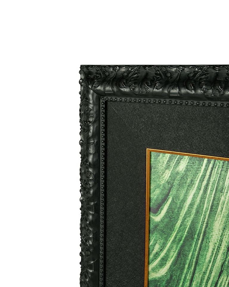 Czarna rama obrazu wpada w kolor zieleni który świetnie współgra ze złotym akcentem na dole.