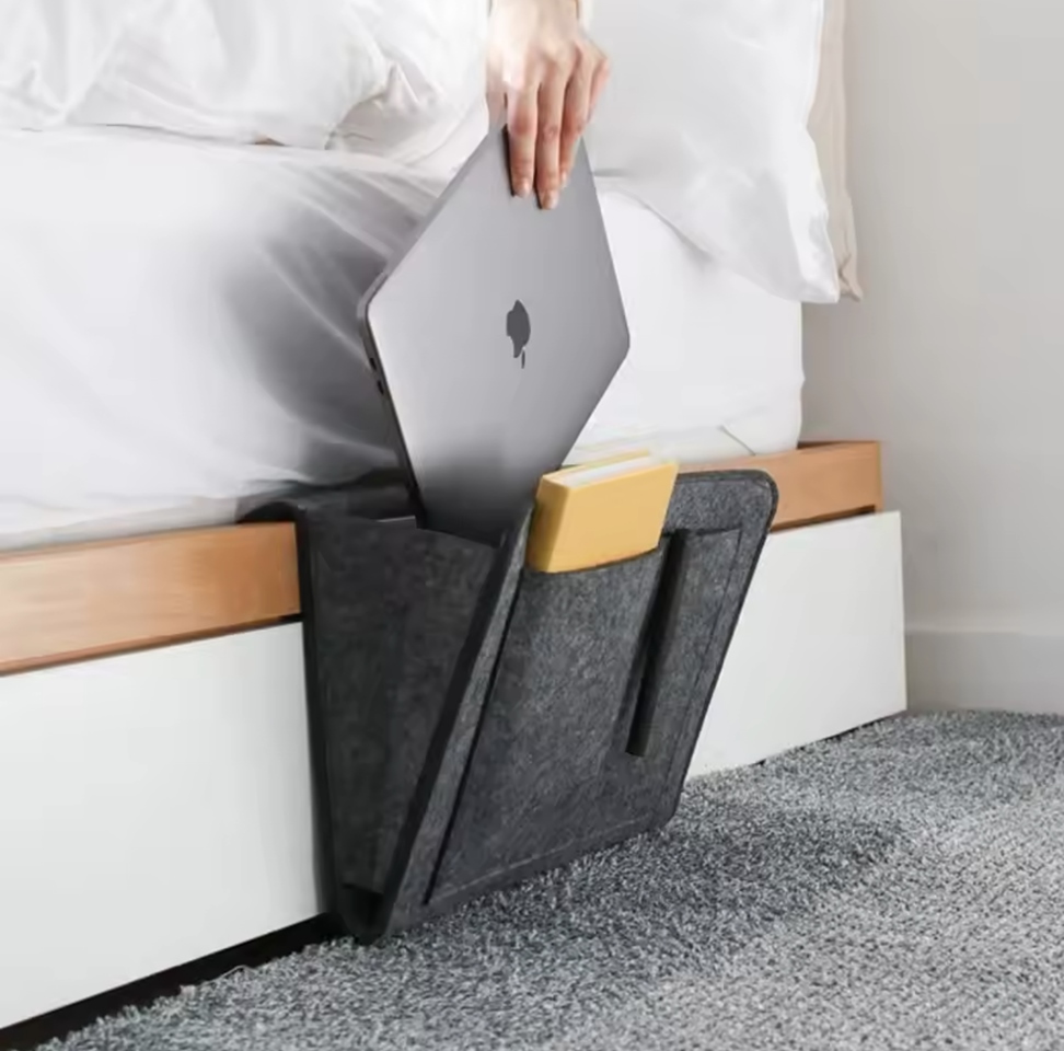 Schowek montowany jest przy krawędzi łóżka lub kanapy, umożliwiając łatwy dostęp do najczęściej używanych przedmiotów, takich jak książki, tablet, piloty czy ładowarki.