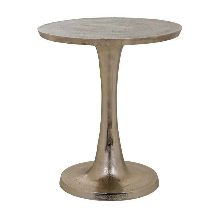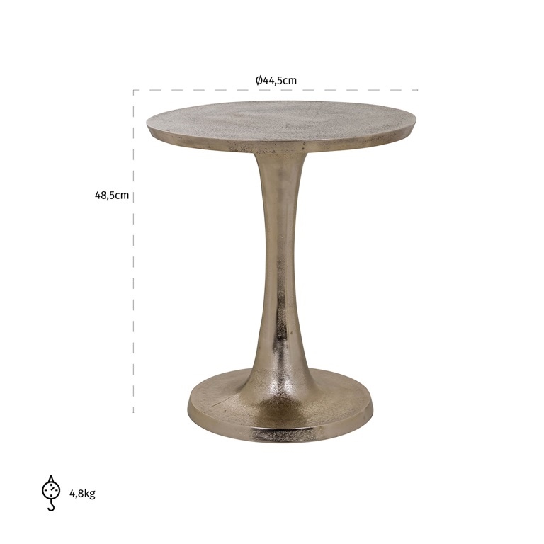 Okrągły blat oraz podstawa wykonana została z eleganckiego aluminium o złotym wykończeniu.