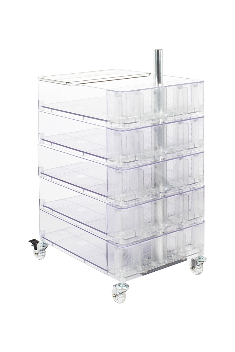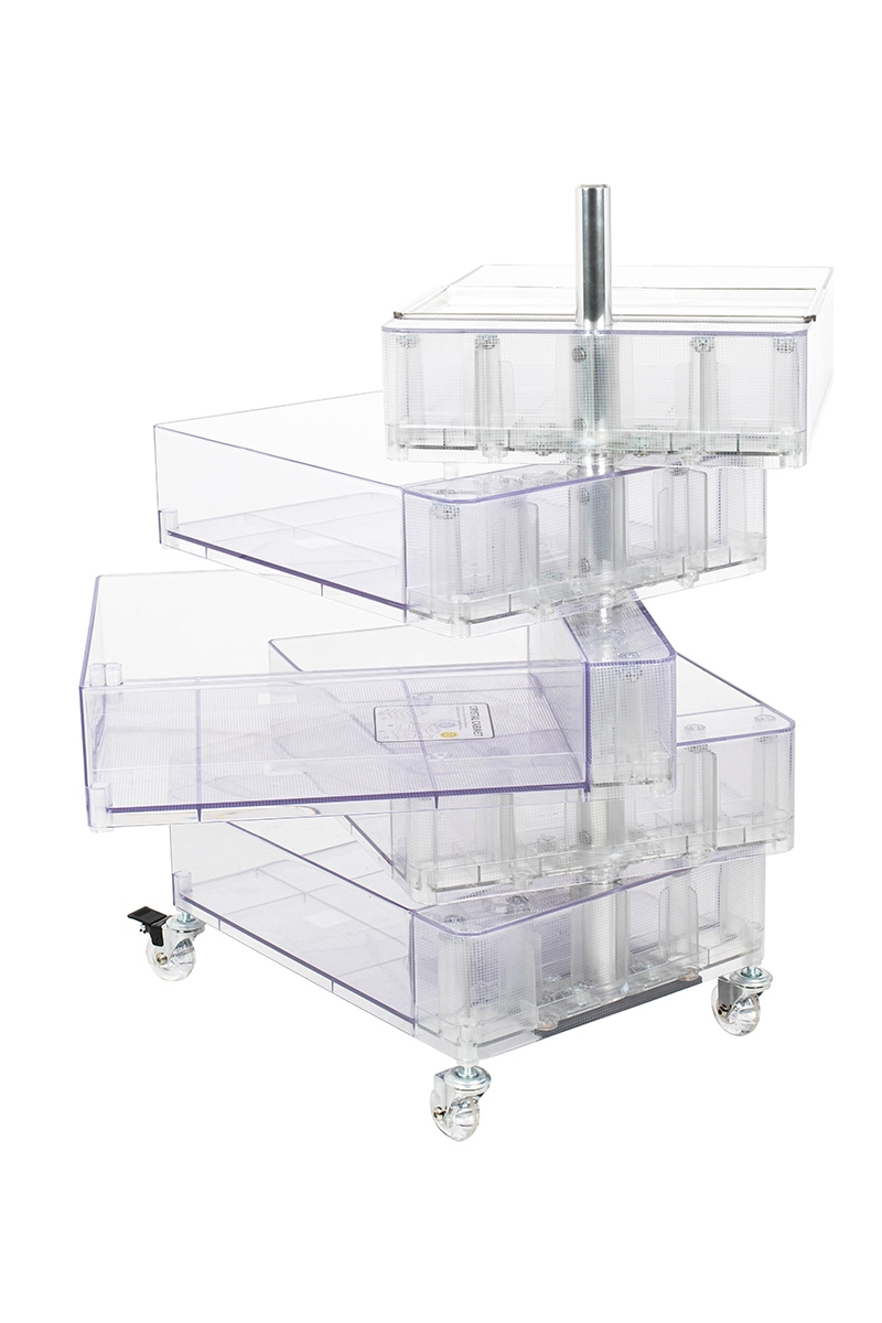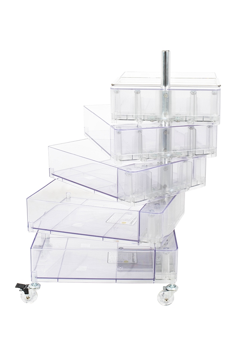 Posiada pięć obrotowych szuflad i cztery praktyczne kółeczka zapewniające mobilność.