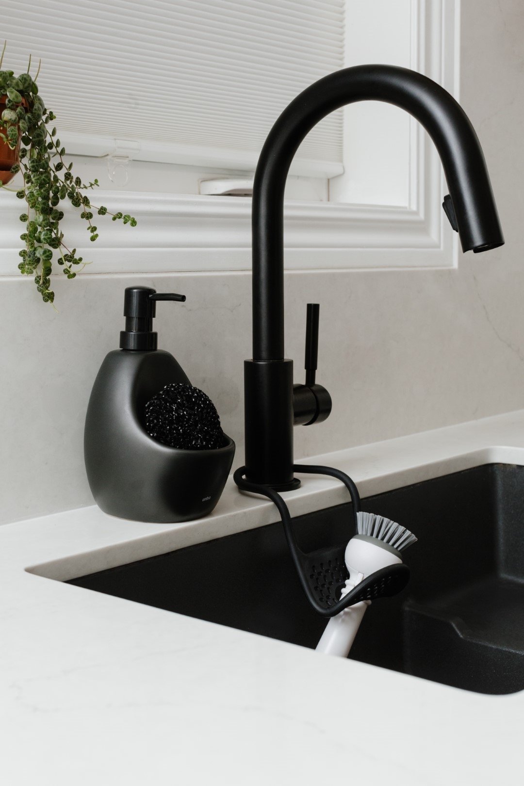 Wbudowany w dozownik, pojemnik pozwoli nam na przechowywanie niezbędnych akcesoriów, takich jak gąbka.